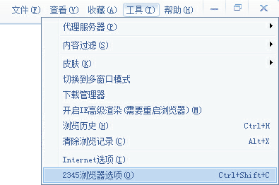 2345瀏覽器設(shè)置主頁(yè)的方法: 1)首先,打開(kāi)瀏覽器上部菜單欄的“工具”欄,在下拉列表中選擇“2345瀏覽器選項(xiàng)”,如下圖所示: