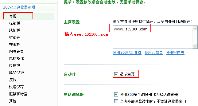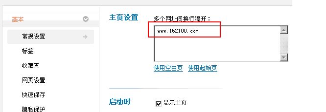2)然后在打開(kāi)的對(duì)話(huà)窗口中的主頁(yè)設(shè)置的地址輸入框中輸入“http://www.ahkuaiqian.com/”設(shè)置修改后會(huì)自動(dòng)生效,無(wú)需手動(dòng)保存。如圖所示:
