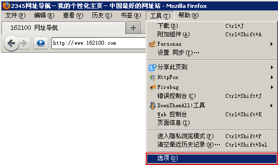 火狐(Firefox)瀏覽器設(shè)置主頁(yè)的方法: 1)首先,打開(kāi)瀏覽器上部菜單欄的“工具”欄,在下拉列表中選擇“選項(xiàng)”,如下圖所示:
