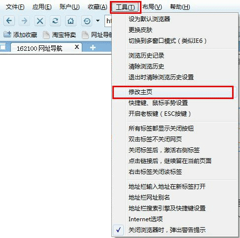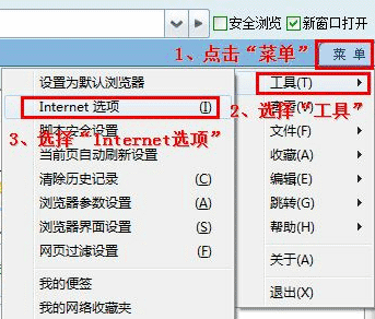 綠色瀏覽器設(shè)置主頁(yè)的方法: 1)首先,點(diǎn)擊瀏覽器右上角的“菜單”,在下拉列表中選擇“工具”—“Internet選擇”,如下圖所示: