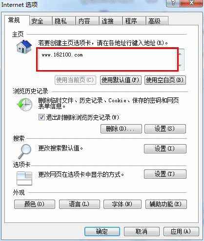 2)然后在打開(kāi)的對(duì)話(huà)窗口中的主頁(yè)欄的地址輸入框中輸入“http://www.ahkuaiqian.com/”,然后點(diǎn)擊窗口上方的“應(yīng)用”按扭即可,如下圖所示: