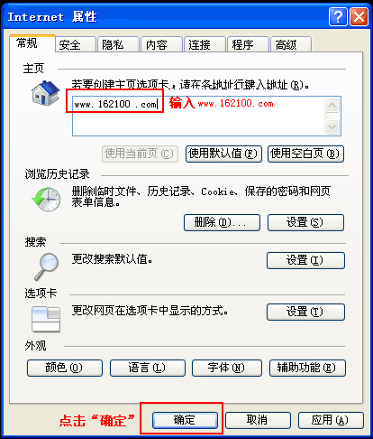 2)然后在打開(kāi)的對(duì)話(huà)窗口中的主頁(yè)欄的主頁(yè)地址輸入框中輸入“http://www.ahkuaiqian.com/”,然后點(diǎn)擊“確定”按扭即可,如圖所示: