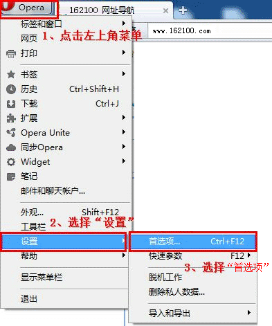 Opera瀏覽器設(shè)置主頁(yè)的方法: 1)首先,點(diǎn)擊左上角菜單按鈕,在下拉列表中選擇“設(shè)置”—“首選項(xiàng)”,如下圖所示: