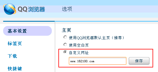 2)然后在打開(kāi)的對(duì)話(huà)窗口中選擇“自定義網(wǎng)址”并輸入“http://www.ahkuaiqian.com/”,然后點(diǎn)擊“保存”按扭即可,如圖所示:
