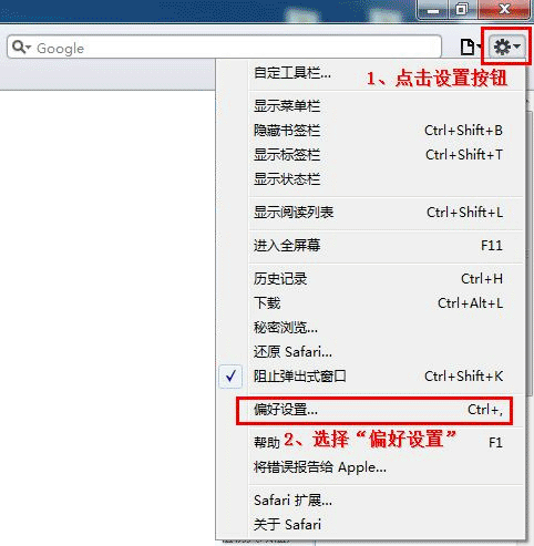 Safari瀏覽器設(shè)置主頁(yè)的方法: 1)首先,點(diǎn)擊“設(shè)置按鈕”,在下拉列表中選擇“偏好設(shè)置”,如下圖所示: